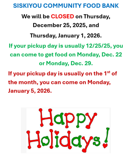 Siskiyou Community Food Bank does not discriminate based on race, color, national origin, sex, disability, age or reprisal or retaliation for civil rights activity.